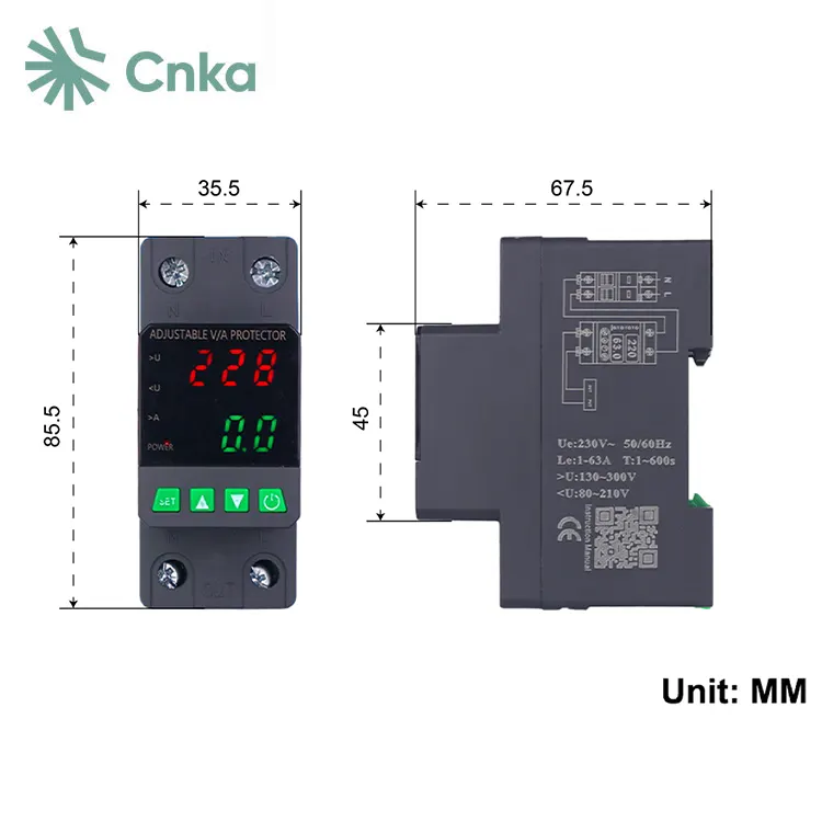 CNKA adalah pembekal Cina yang terkenal yang menyediakan borong pelindung voltan paparan dua jenamanya. Peranti ini direka khusus untuk litar AC 220V, 50Hz fasa tunggal dengan arus yang diberi nilai 63A, menjadikannya pilihan yang ideal untuk melindungi kotak pengedaran kediaman atau wayar yang membekalkan kuasa kepada peralatan fasa tunggal.